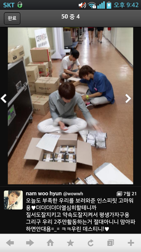 식혜와 떡을 고르는 것부터 스티커 제작, 포장까지 직접하고 모든 일을 사비로 해결하며 메모까지 멤버마다 다르게 써주는 섬세한 인피니트.