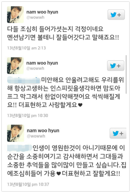 한 가수가 특정한 위치에 오르기까지의 노력은 그 팬이 잘 알기에, 우리도 인피니트의 노력을 가장 잘 아는 사람들로서 적어도 인피니트의 이미지를 깎는 팬은 되지 말아요!! 가수의 이미지는 팬덤이 만든다는 말도 있듯이 인피니트의 노력이 폄하되지 않도록 노력해야죠!!