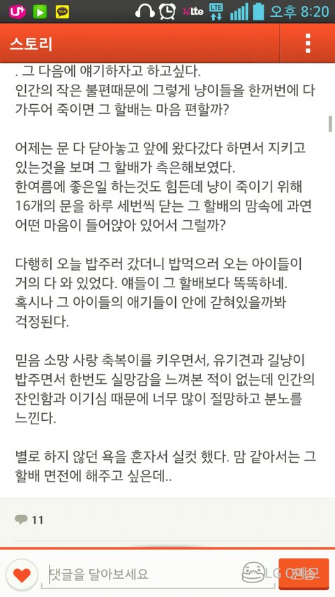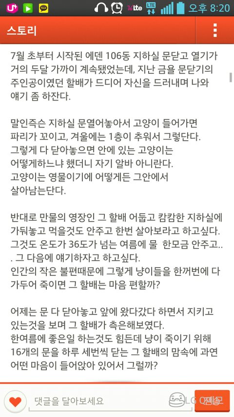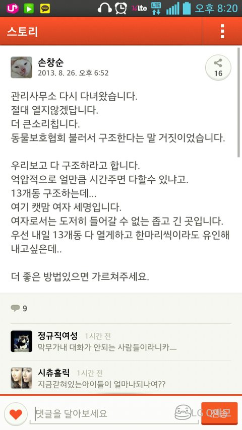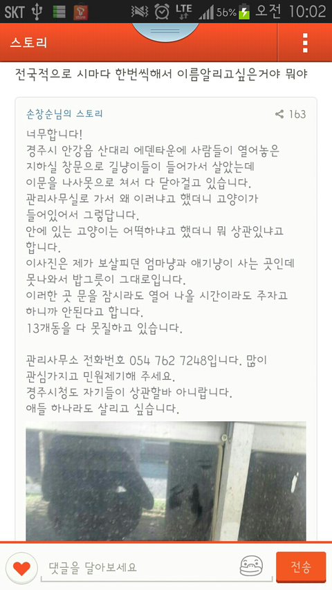 지금 경주시 안강읍 산대리 에덴타운에서 지하실에 살고있는 어미 고양이랑 아기 냥이를 나오지 못하게 창문에 못질을 했답니다. 제가 글을 오래 쓸수도 없고 잘 쓰지도 못하니 그냥 핸드폰 캡쳐한것을 올리겠습니다.