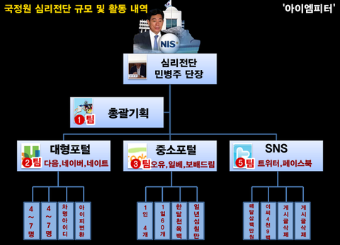 국정원 심리전단은 민병주 단장을 주축으로 총 4개팀이 있습니다. 1팀은 총괄,기획을 2팀은 대형포털 (다음,네이버,네이트)을 3팀은 중소포털(오늘의 유머,일간베스트,보배드림,뽐뿌,SLR클럽,82쿡 등)을 담당했습니다. 5팀은 SNS (트위터,페이스북,미투데이 등)를 담당했습니다.