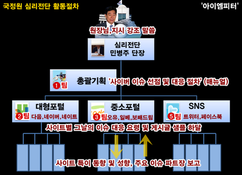 국정원 심리전단은 '사이버 이슈 선점 및 대응 절차'라는 매뉴얼에 따라 움직였습니다. 그 매뉴얼의 기초는 원세훈 원장의 '원장님 지시,강조말씀'이었고, 그것을 기초로 사이트별로 어떤 이슈를 주제로 글을 올릴지가 결정됐습니다.