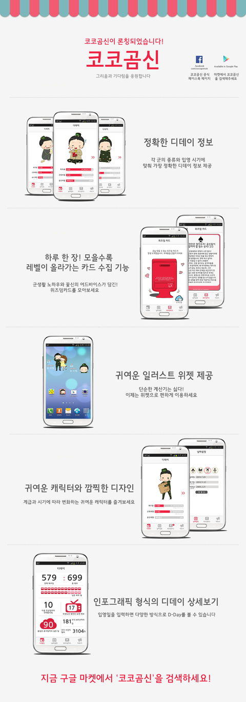 곰신 레벨'도 쌓는 재미를 느낄 수 있습니다.3. 단 한 번의 설정으로, 군화의 전역일, 진급일, 휴가일을 바로 알 수 있는 간단한 구성과 귀여운캐릭터가 들어간 깜찍한