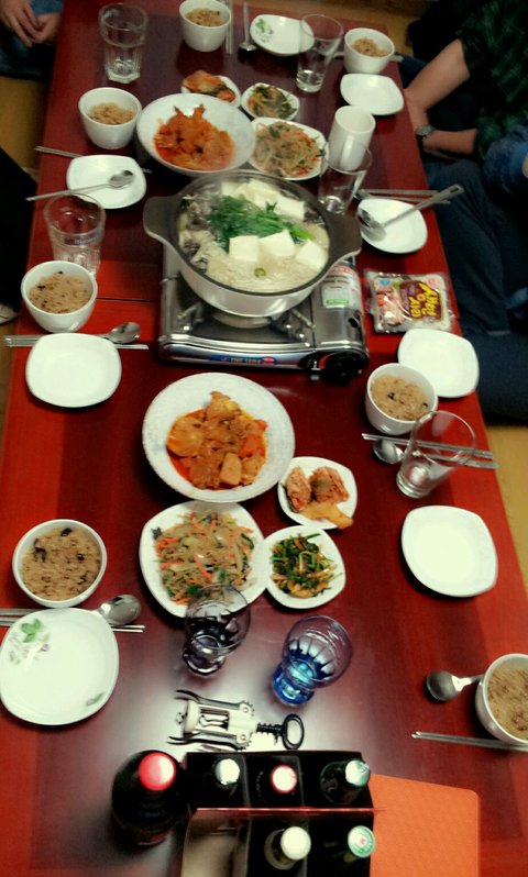 내 친구들과 함께하던 조졸한 집들이 가운데에 끓고있는건 만두전골 & 옆엔 닭볶음탕