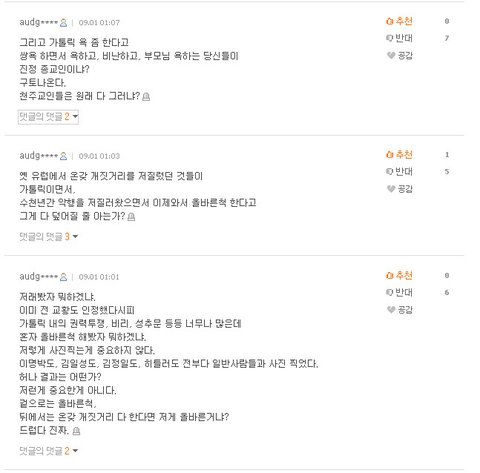 "audg"란놈은 전형적인 개독이며 종교관련 뉴스댓글에서타종교 무턱대고 까는 개독으로 유명합니다. ㅋㅋㅋ