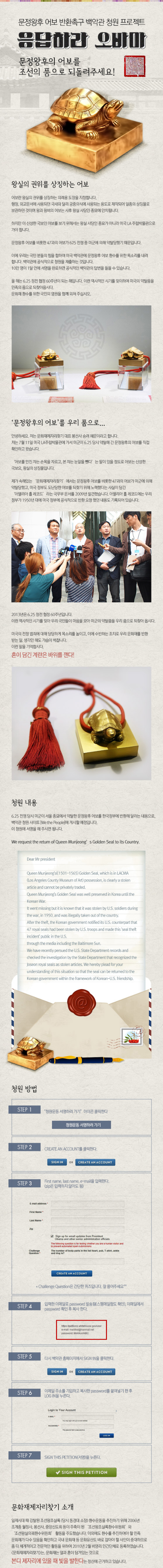 이에 '문화재제자리찾기' 에서는 대한민국 국민의 힘을 합하여 미국 백악관에 문정왕후 어보 환수를 위한 목소리를 내려고 합니다. 백악관에 공식적으로 청원을 제출하는 것인데, 10만명이 1달 안에 서명을 완료하면 공식적인 백악관의 답변을 얻을 수 있습니다. 위의 사진을 참고하여 참여해 주세요!