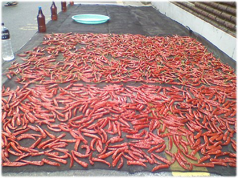 싱그러운 아침 햇살 아래 가득 널어진 빨간 고추에 눈이 부셨다.