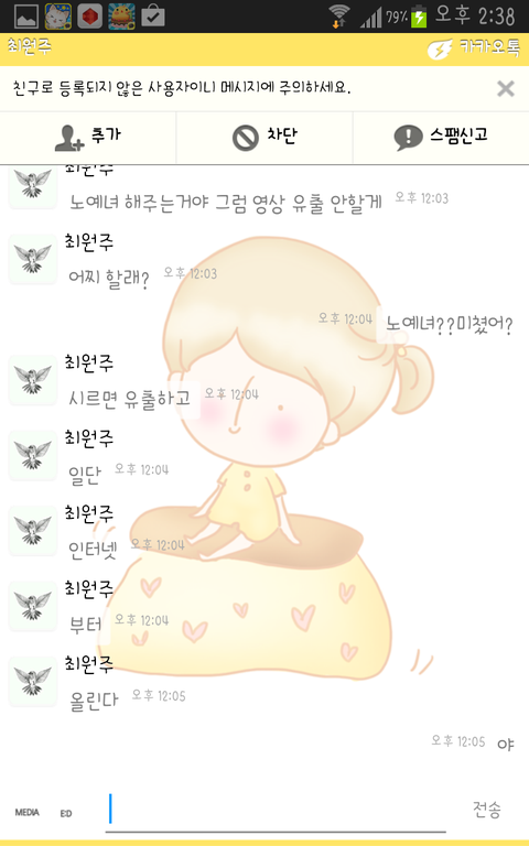 그러니깐자기노예하라는거예요ㅠㅠ그래서무서워서하고잇는데생각해보니만난적없는거같은거예요이미올려서동영상을팔앗데요막카톡으로야한소리도하구욕도하고그래요친구한테다털어놨더니경찰서에신고하라는데겁나서못하고있어요ㅠㅠ