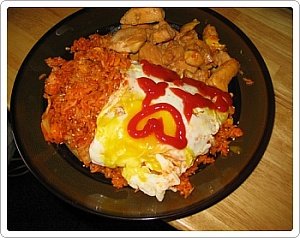 - 달군 팬에 밥 넣고, 계란 넣고 익히다가 슬라이스 치즈 1장 (1인분 기준)