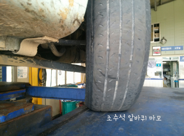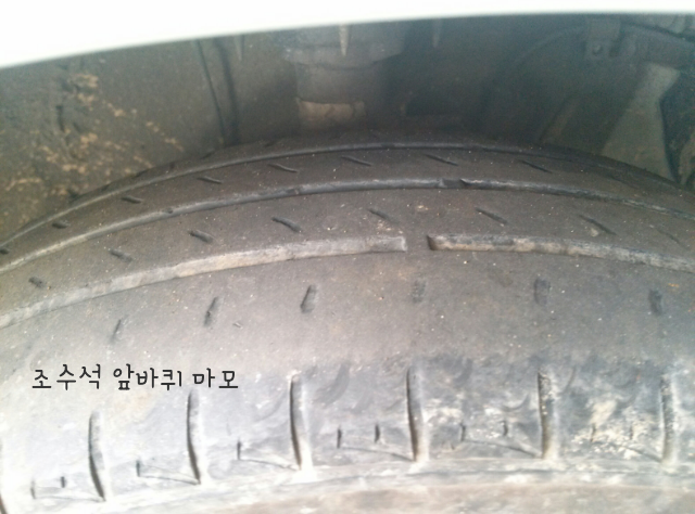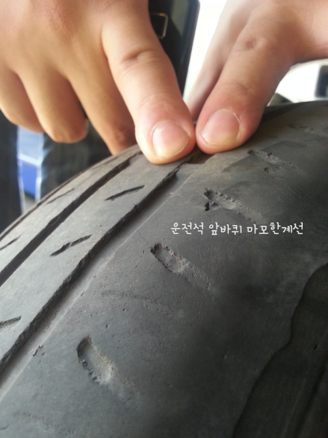 공업사에서도 이건 타이어마모한계선을 옛날에 지난차라고 하며 운전석앞 타이어만 교체하면 조수석 앞쪽의 타이어가 위험하여 출고해줄수없다고함.