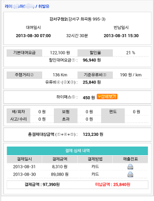 차량렌트 내용임. (이용료 및 유류비 참고용)