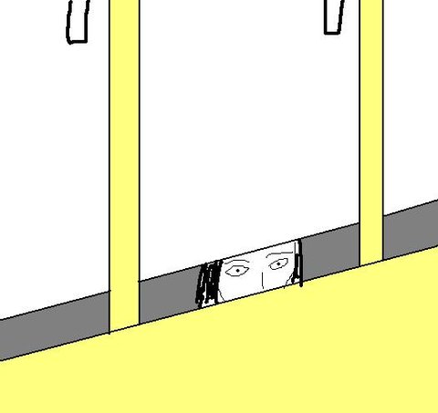 아이의 얼굴이 화장실 문 밑의 틈새에서