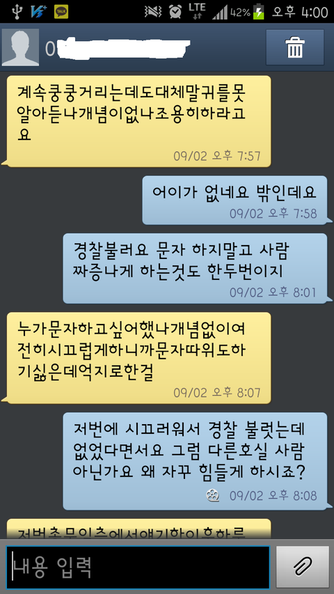 결국은 제가 시끄러운 시간대를 적어놓으시던가, 그렇게 시끄러우면 핸드폰으로 음성녹음을 하세요, 경찰 부르세요, 하고 시끄러울때 연락하라고 연락처를 교환했는데 이런 문자가 오더군요.