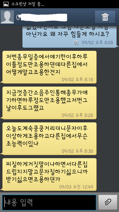 제가 밖에있을때도 시끄럽다고 하고, 모르는사람한테 이런식으로 문자 보내는것 자체가 이해가 안가네요. 마음같아선 골프채로 한대 후려버리고싶지만 그래도 참고 부동산에 연락해놓고, 수신거부랑 카톡 차단 해놓은 상태입니다. (총무말로는 같은라인으로 연결되있는 호실에 저밖에 없어서 제쪽 라인에서 소리가 난다고 하고, 총무는 제가 조용히 지내는걸 알고있습니다. 총무도 손발 다든상태고 참 짜증나네요.)