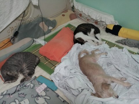 암컷만 (개1, 고양이2, 사람1) 있던 음기탱천한 집에 숫놈 하나 들어오니...좋아요...흐흐...좋아...