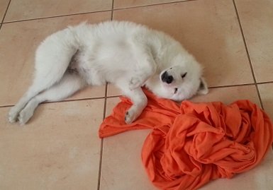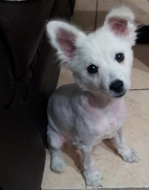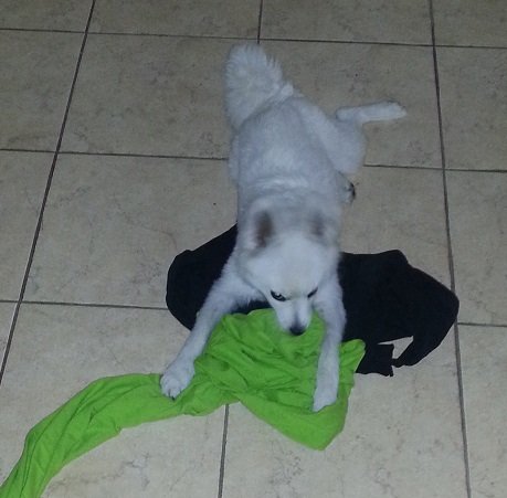 개껌을 놔두고 원단을 씹어 제끼는 당신은 누구세요? 아..저 눈빛..털 그따구로 밀었다고 반항하는 것 같은 느낌이 드는 건..제 기분 탓이겠죠?
