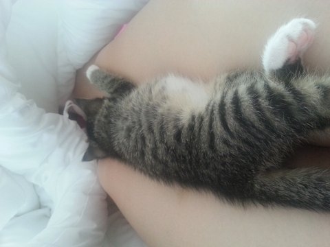곤히 잠든 치즈에겐 미안하지만 살포시 들어서 제 다리위에 올려놓음