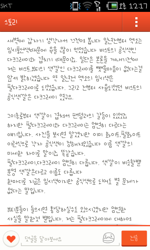 뭐 좀 다르다고쳐요 근데 막상 음악방송이나 여러다모여서하는 드콘같은데 가면 누가누구껀지도모름 저사람은엑소팬이였지?저사람은비스트팬이였지 하면서 얼굴을 다 외울수도없는거고 , 또 무대랑은 멀리떨어져있는 있는데에서 그렇게 풍선흔들면 그 멀리 서있는 엑소나 비스트가 아저거 우리팬이네 이러면서 알아볼수있을거라 생각하는 건가 지금? 엑소팬쪽에서도 우리가 그동안지켜온만큼 우리 입장에서 생각해주고 좀 배려해줘야 되는거 아닌가요? 풍선을 그렇게 흔들고있는데 그 조금 반짝이는게 보입니까? 또 글씨가 보이나요? 멀리서보면 똑같아 보이는여 자기 가수한테 우리가 너네 팬들이다 알려주려고 공식색 정하고 자랑스럽게 흔들고 다니는건데 꼭 이렇게 논란일어나게 해야겠어요? 엑소팬들끼리 좀 해서 정리를 하도록해야지 무조건 이색이 자기네꺼라고 하면 누가 화 안나겠어요 뷰티들이 힘들게 지켜왔던게 다크그레이 인데 이렇게 뺏기는건 아니잖아요 서로 입장에서 생각해보면서 배려하는 좋은 팬덤문화 만들면 어디덧나? 임시색이라고해서 기다려준게 이제 1년이넘고 2년이 다되가 그래도 처음에는 임시색이니까 금방바꾸겠지 해서 아무말 안했는데 1년이 넘었는데 안바꾸고 도리어 그쪽들이 우리한테 화를내고있으니 뷰티들 기분이어떻겠어요 우리입장 고려하고 이해해주세요 제발 이런일 더 크게 만들어서 싸우고싶지 않습니다 다크그레이는 누가뭐래도 비스트랑 뷰티껍니다 지켜주세요.