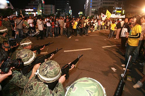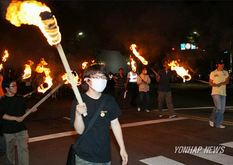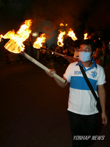 이들에게 횃불을 들고 모형총을 쥐어주는 미치광이 집단