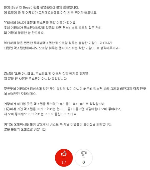 뷰티분들, 아육대에서 저희 엑소팬들이 뷰티석에서 난리 친점 진심으로 다시한번 사과드리겠습니다. 한가지 부탁드리자면, 이기광 으르렁춤은 이제 그만 덮어주세요. 루머입니다.