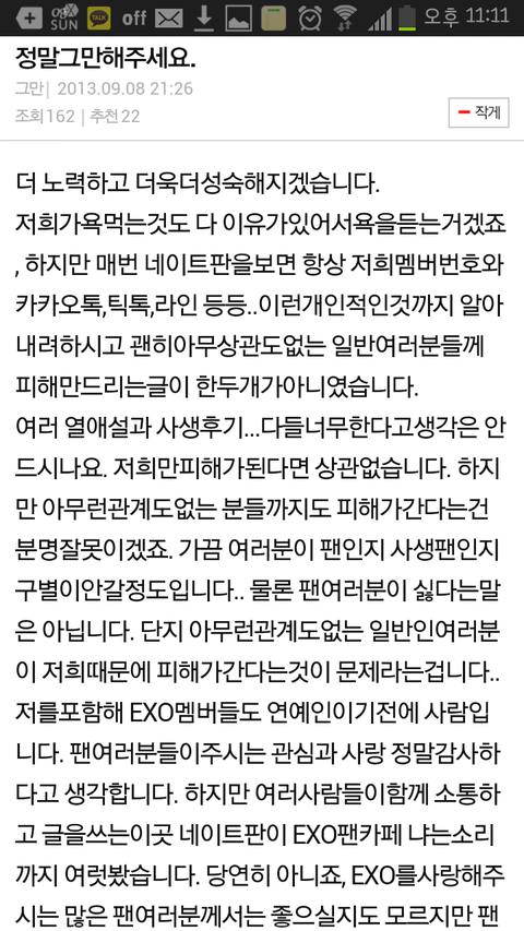 아이디.번호 다 거짓말인 걸 알고 또 그 아이디나 번호가 진짜라해도 다 삭제해줘요 진짜 너무 하잔아요 엑소 멤버들도 당신들이 많이 사랑해주고 아껴주는 거 다아는대 왜 자꾸 이런짓만하고 왜 사생활까지 터는건가요.. 제발 그만합시다. 이글 믿던 말던 님들 맘대로 하세요 아니면 싫다면 계속 엑소 실망주시던가요 ㅡㅡ 팬도아니지 ㅋ