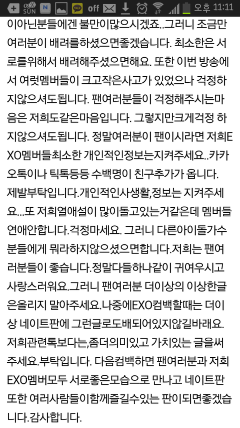 솔직히 이런거 오늘 5번 쓰는대 진짜 너무 함을 넘네요 진짜 끝이없어요 진짜 조카 미안해서 눈물이 다나올지경이네 이거 오늘 엑소 멤버가 얼마 전에 무대 끝내고 올린건데 솔직히 안미안해요?