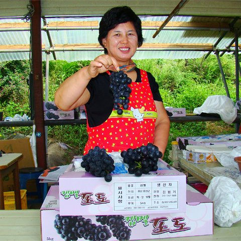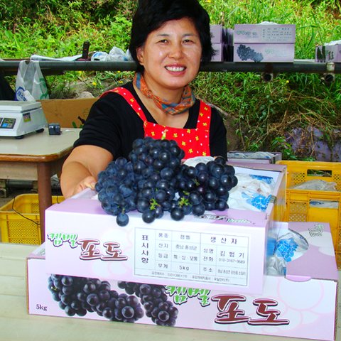 제초제를 전혀 사용하지 않고 저농약으로 재배한 탐스런 포도송이를 방문구매차 오는 고객들로 북적이고, 주인은 맛보기도 권하고 포도알 손질에 바뿌다.