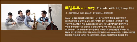 버클리음대 재학 시절 결성하여 10년된 프렐류드이번 폴인어쿠스틱 페스티벌 2013에서는 5집에 피쳐링을 했었던허소영씨도 함께 한다고 하네요.프렐류드는 그들이 다루는 악기에 대해서 이미 국내에서 인정을 받고 있는 실력파들이랍니다.또한 리메이크를 통해서 원곡과는 다른 분위기를 연출하기도 하죠.