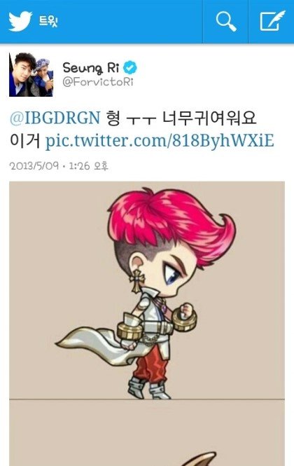 이제 세번째 이땐 지드래곤 윈드러너 캐릭터가 나왔을때임 승리가 지디한테 캐릭터 너무 귀엽다고 멘션을 보냄