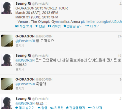 승리가 트위터로 지디 월드투어 홍보를함 지디는 고마워요형하면서 장난을 치고ㅋㅋ승리는 지디 장난을 귀엽게 받아드림 반말로 권지용 화이팅ㅋㅋㅋㅋㅋ마지막 깨알 하트까지ㅋㅋㅋㅋㅋ생각지못한 반응이었나봄 지디가 죽을래라곸ㅋㅋㅋ승리는 거기에 당황해서 이모티콘을ㅋㅋ이 남자들 볼수록 귀엽게 노네
