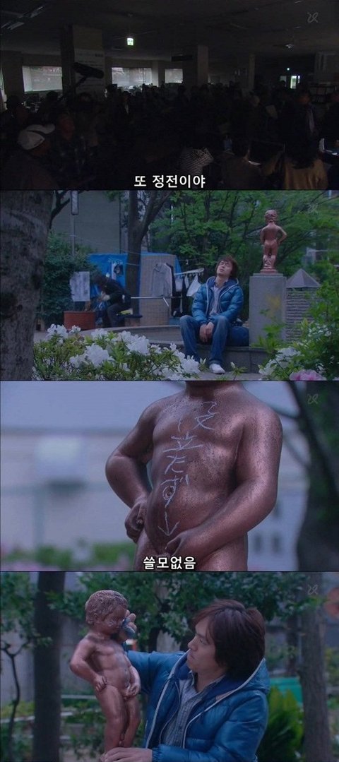 석유 고갈로 빈번히 일어나는 정전으로 밖으로 나선 남주는 '쓸모없음'이라는 낙서가 써진 동상에 왠지모를 동질감을 느껴 수건로 닦아줌. 그러던 도중 소변이 마려워진 남주.