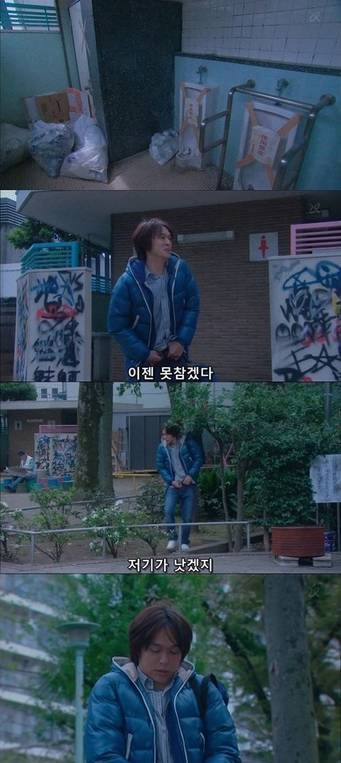 화장실을 찾지만 사용하지 못하는 곳들 뿐이고, 찾다찾다 어쩔수 없이 드럼통같은것을 찾아 방뇨를 하는 남주.
