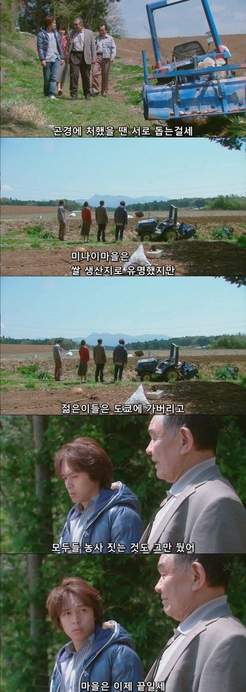 미나이 마을은 원래는 쌀생산지로 유명했지만, 젊은사람들이 다 도쿄로 상경해버리고 노인들 밖에 남질않아서 농사를 포기했다함. 마을은 이제 끝이라며 깊은 한숨을 쉬는 촌장의 모습에서 짠함을 느낀 남주.
