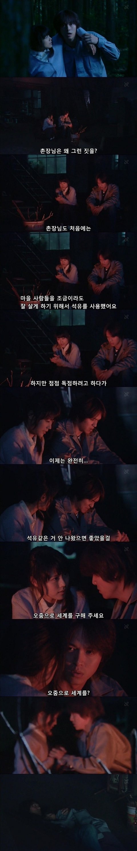 원래 촌장도 마을을 위해서만 석유를 사용하려 했지만, 인간의 욕심은 끝이 없는 터라 돈을 벌기위해 그렇게 변했다함. 그러면서, 그 둘의 사랑은 점점 깊어지고 ...