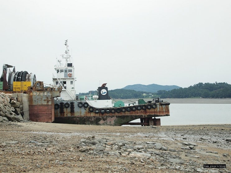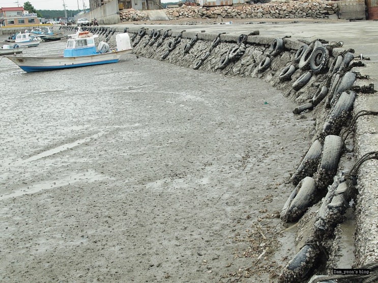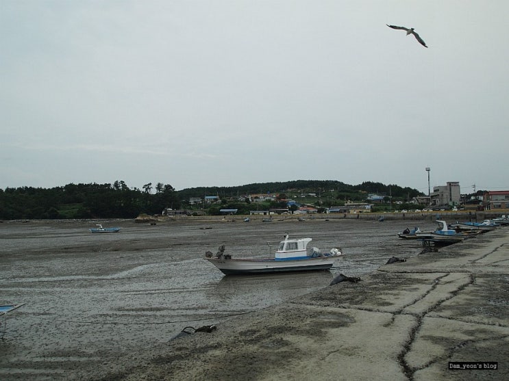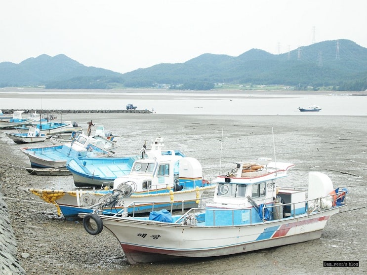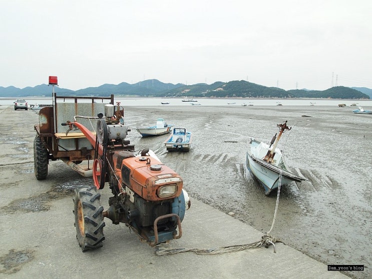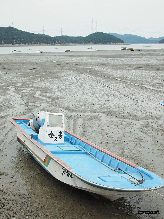 썰물시간. 갯벌에 빠진 배들