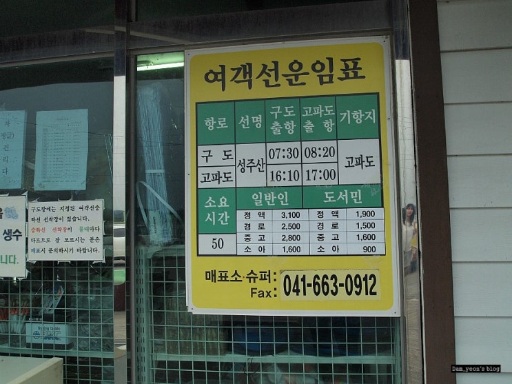 운임표. 당일치기로는 구도와 고파도엔 갈 수는 없겠다..