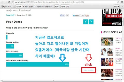 미국가수와의 접전이 있을것 같은데 지금은 지디가 70퍼센트대까지 올라갔지만 자고 일어나면 또 뒤집어져 있을 가능성이 높아요. 시간대가 다르니까. 그니까 미국시간대가 덜 활발한 시간대일때 퍼센트를 높이 올려서 쉽게 못 뒤집게 해야 계속 쭉쭉 퍼센트 올리는데 편해요.