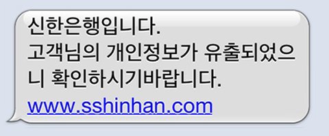 스미싱이란 보이스피싱과 SMS를 합친 말로 문자메시지를 이용한 휴대폰 해킹 기법입니다.