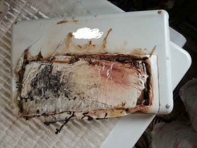 오늘 자세히 보니 넷북에서도 배터리 부분이 심각하게 파손되었습니다. 그 앞쪽 키보드도 녹아서