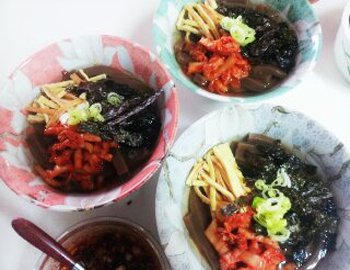 계란지단, 김, 김치, 파 올려서 멸치 다시마 육수에 양념장 넣어 먹기!