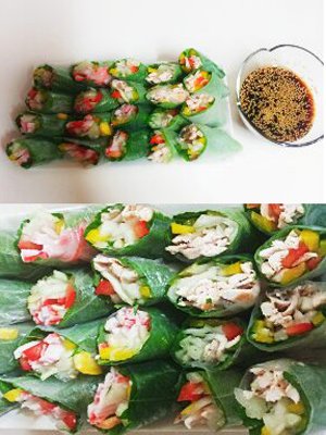 넘 맛있어요 이거... 월남쌈에 깻잎깔고 한가지는 크래미로, 한가지는 닭가슴살로 야채넣고 둘둘 말아주면 완성! 이쁘게 말지는 못했지만.. 그래도 색감좋죠^^ 저건 오리엔탈 소스 만든다고 만들었는데.. 그냥 남아있던 땅콩소스에 먹음 ㅋ