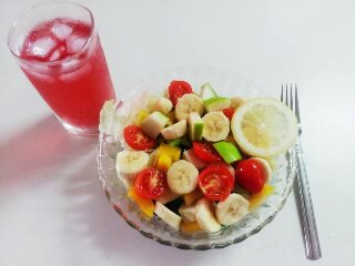 야채, 사과, 바나나, 토마토, 파프리카, 블루베리 위에 블루베리 홍초, 레몬즙을 드레싱삼아 뿌려먹었더니 완전 굿이더라구요! 다이어트 중이라 해먹었는데 넘 배불러서 다 못먹구 반 남겼어요 ㅎㅎ