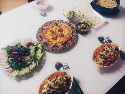 엄마가 동생데리구 얼른 병원 갔다와서 먹자고 하셔가지구 한시간 여유 남은김에 스파게티랑 피자까지 했네요ㅋ 사진이 실물만 못한게 아쉽지만 ㅠㅠㅠ 동생이랑 엄마는 레스토랑 온기분이라며 넘 좋아했어요 ㅎㅎ 저기 쪼끄맣게 잘 안보이는건 고구마샐러드 !