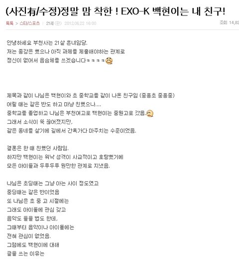 진짜변백현힘내라ㅜㅜ사생들한테 시달리고 온갖 루머에 힘들텐데.. 팬과안티는비례하는거니까 이렇게 동창들이 얘 과거에 대해 인증한게 몇개나되는데 아직도 얘가 멘탈쓰레기니 날라리니 하는 사람들보면 답이없음 그렇게 변백현이 못마땅한가봄
