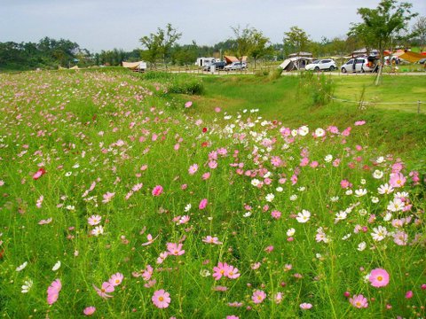 승촌공원 오토캠핑장 주변 코스모스 꽃길은 오토캠핑장 입구부터 산책로를 따라 5,000㎡, 0.5㎞구간에 이른다.