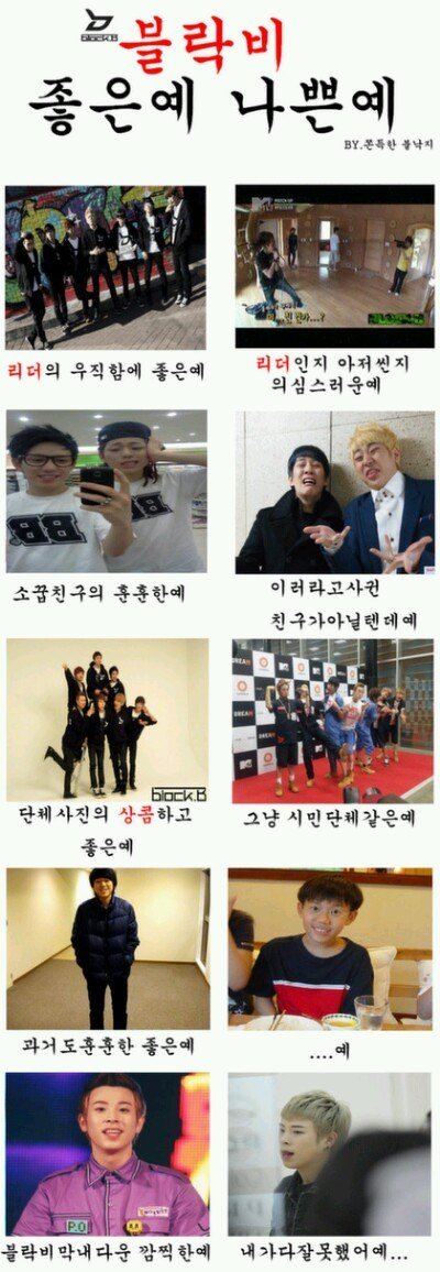 블락비는 힙합느낌이 굉장히 강하고 워낙 랩라인이 출중하기 때문에 보컬들이 묻힐수도 있는데그와중에도 제역할 톡톡히 해내는 태일은 정말대단하다.태일도 잘 알려지지않은 개성파 탈아이돌급 보컬이라 생각되는데,정말 블락비를 위한 보컬이라 보면 될만큼 목소리가 이팀에 정말 잘어울린다.재효는 비주얼담당답게 잘.생.겼.다. 블락비 서브보컬이지만 얼굴값 한다고 해야하나,'아이돌중' 어디가서 꿀리는 '서브보컬'은 아니므로 팀에 플러스요인을 잘 해내고 있는듯하다.유권이나 비범도 기본기는 탄탄하고 목소리도 좋으나 아직까진 춤이 보컬보단 훨씬 뛰어난듯하다.