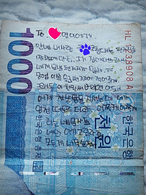 아무튼 이 천원편지가 어떻게 흐르고 돌아 제손에 들어오게된진 모르겠지만 다른사람들에겐 그냥 낙서된천원 짜리일지 몰라두 편지를쓴 육군군인분과그의 여자친구분께는 두사람만의 예뿌고소중한 추억일거라 생각듭니다.