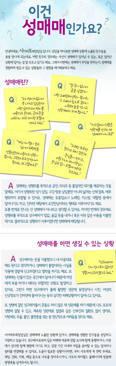 가출을 하고 있는 친구들중에는 일행을 구하거나 가출팸을 구성하는 경우가 많은데요. 모든 일행들이 그러하는 것은 아니지만 다수의 경우 남자와 여자가 일행이 될 경우에는 처음에는 서로 의지하고 아껴주지만 생활이 어려워지게 되면 남자 혹은 같은 여자일행들을 여자일행에게 조건을 알선하여 조건만남을 강요하고 여자들은 남은 일행들의 감시와 감금으로 조건만남이나 유사성행위로 생활을 유지하는 경우가 많이 있습니다.