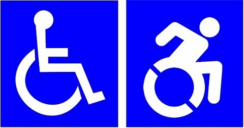 파란 네모 바탕에 휠체어에 앉아있는 사람이 그려져 있는