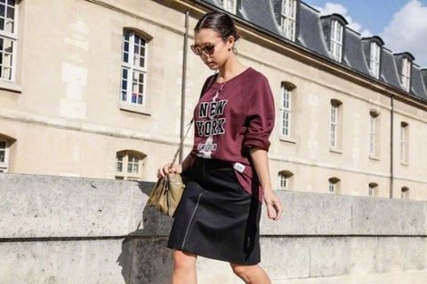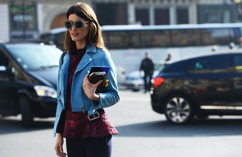 버건디 컬러가 물든 가죽 재킷을 매치해 세련되고 빈티지한 캐주얼 룩을 즐길 수 있다