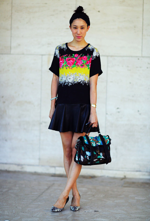 광택이 도는 레더 블랙 플레어 스커트로 매치해 은근한 섹시함 강조